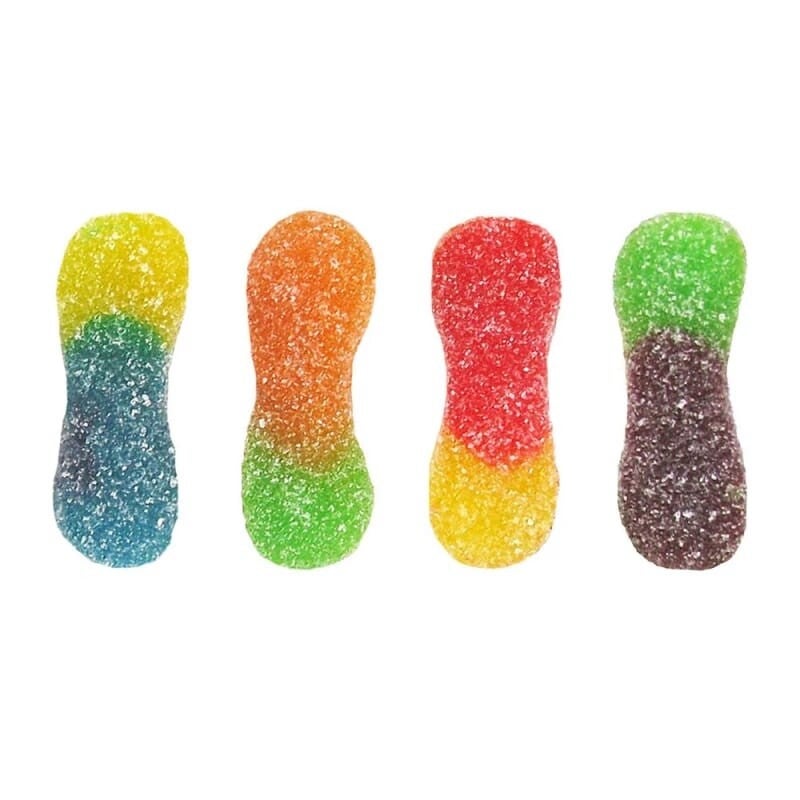 Ingrédients : (sous réserve de modification par le fabricant) Sirop de glucose, sucre, eau, gélatine de boeuf, amidon modifié de pomme de terre, acidifiants : E296, E330, E270, arômes, agent d'enrobage : cire de carnauba, colorants : E100, E129, E133. Sans Gluten, Halal.