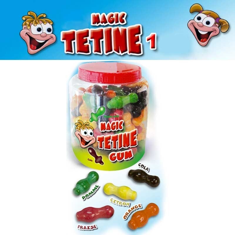 La Magic Tétine Gum se décline en 5 goûts et 5 couleurs assorties: fraise (rouge), pomme verte (vert), cola (marron), citron (jaune) et orange (orange).