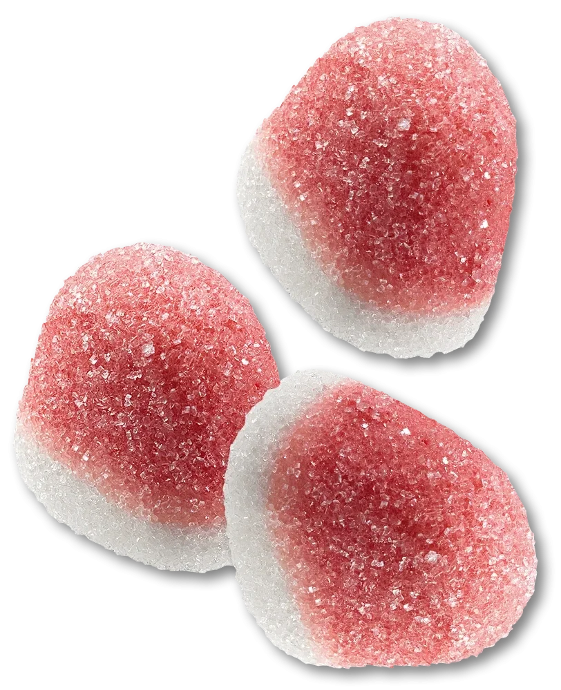 Sirop de glucose; sucre; gélatine; acidifiants: acide citrique, acide lactique; jus de fraise à base de jus de fraise concentré; gélifiant: pectine; arômes; colorant: carmin.