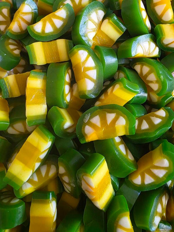 Ingrédients : (sous réserve de modifications par le fabricant) Sucre, sirop de glucose-fructose, farine de blé (contient gluten), amidon de maïs, humectant: glycérol; sirop de sucre inverti, acidifiant: acide citrique; graisse végétale de coco, fécule de pomme de terre, arômes, gélatine, correcteur d'acidité: citrates de potassium; huiles végétales (coco, colza), sel; colorants: E100, E133. Allergènes : GLUTEN, SOJA, MOUTARDE.